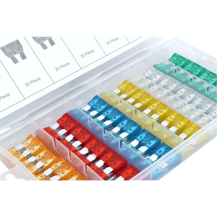 120 assorted commonly replaced fuses. Packed in handy divided carrying case and contains 20 each of: 5, 10, 15, 20, 25 and 30 amp fuse