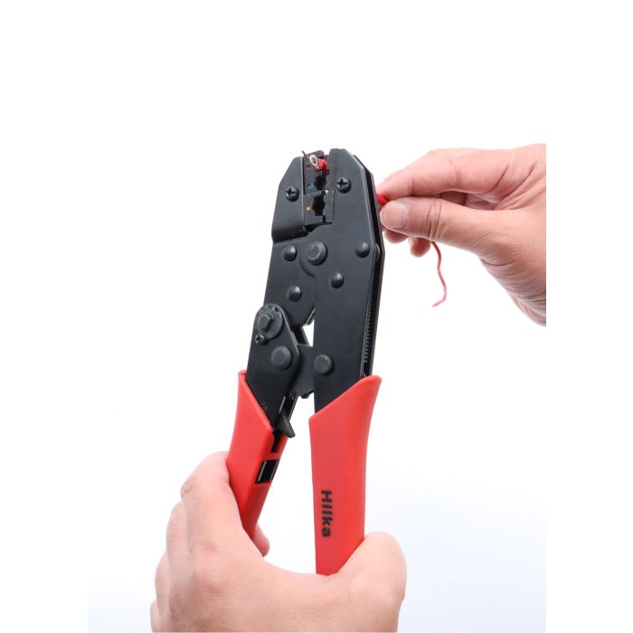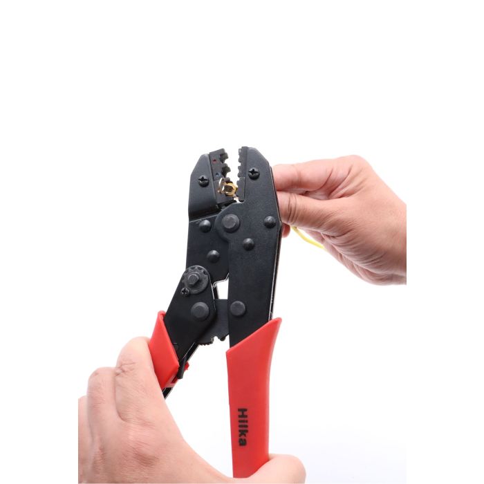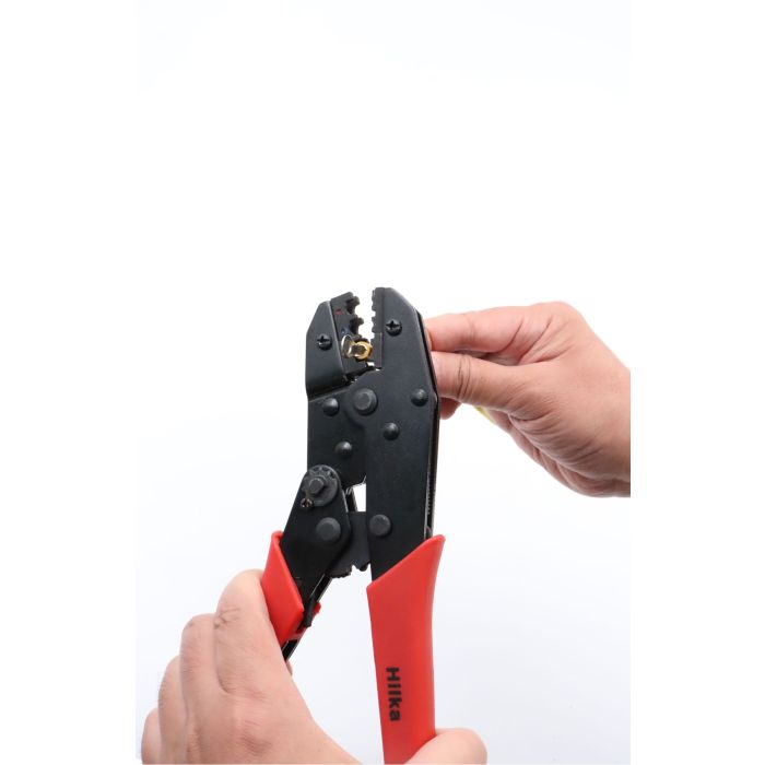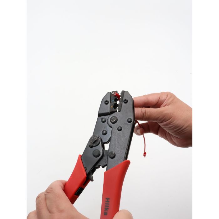 Hardened steel jaws and precision action guarantees professional crimping. Suitable for red, blue and yellow terminals. Ratchet action is adjustable by loosening the locking screw, resetting the wheel and replacing the locking screw. Cable sizes: Red – 1.5mm² (22-16 A.W.G.), Blue – 2.5mm² (16-14 A.W.G.), Yellow – 4.6mm² (12-10 A.W.G.)