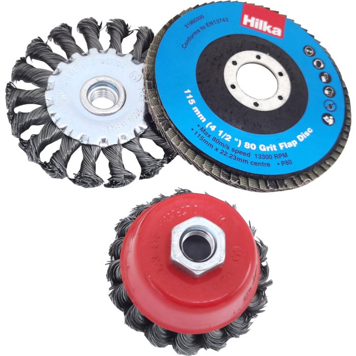A complete set for aggressive preparation and metal shaping for use with angle grinders. Twist knot wheel and cup brush are ideal for fast aggressive removal of rust, scale, and paint. Flap wheel for general sharpening tasks on spades, mower blades, shears, axes and similar.