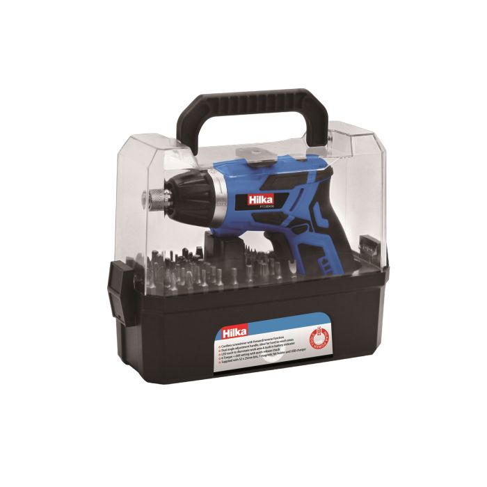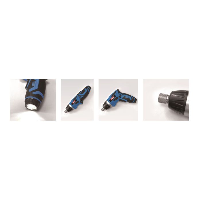 LED torch to illuminate the work area with built in battery indicator. 6 torque + drill settings with quick release chuck. Supplied with 52 x 25mm bits, 1 magnetic bit holder and USB charger. No load speed: 230rpm. Battery capacity: 300mAh. Recharges from most USB sources.